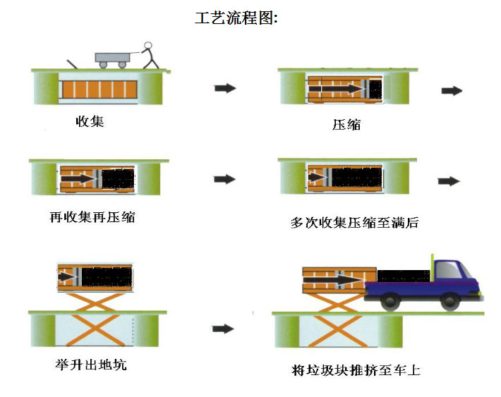 1.主要特點(diǎn) ◇平穩可靠:兩側舉升,剪叉跨度大,升降平穩,無(wú)傾斜; ◇淺地坑:地坑深度僅為1.55m,保潔及維修極為方便; ◇高效率:壓實(shí)每噸垃圾時(shí)間≤10min; ◇全封閉水平壓縮:采用水平壓縮方式,垃圾壓縮密度≥0.86t/m3,垃圾壓縮后體積大大減小,從而大幅度提高轉運車(chē)輛裝載量和轉運效率,降低垃圾處理、轉運等費用; ◇動(dòng)作少,故障率低,整套設備的垃圾壓縮、裝車(chē)由三個(gè)動(dòng)作完成,簡(jiǎn)單實(shí)用,各動(dòng)作之間安全互鎖,防止操作人員誤操作造成安全事故,安全可靠; ◇垃圾儲存、壓縮及寄存全部在地面以下,地面上沒(méi)有垃圾散落,對環(huán)境影響較小,環(huán)保性好;垃圾壓縮后密度高,水份少,可避免汽車(chē)運輸中的垃圾散落、污水滴漏現象,避免二次污染; ◇土建費用低,占地面積小,可以不蓋大型工作間,既節約了投資,也縮短了工期; ◇留有專(zhuān)門(mén)的維修窗口,維修保養方便; ◇設有固定式操作和遙控器兩種操作模式,方便實(shí)用; ◇自動(dòng)化程度高,可大幅提高工作效率,降低勞動(dòng)強度。