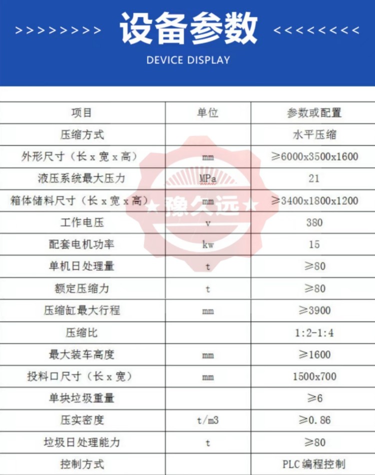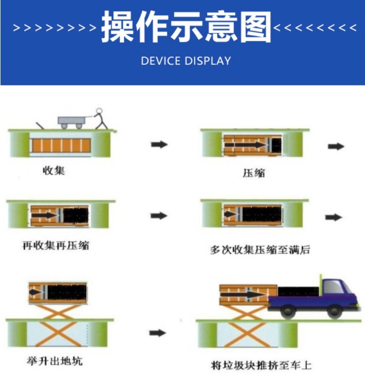◇平穩可靠:兩側舉升,剪叉跨度大,升降平穩,無(wú)傾斜; ◇淺地坑:地坑深度僅為1.55m,保潔及維修極為方便; ◇高效率:壓實(shí)每噸垃圾時(shí)間≤10min; ◇全封閉水平壓縮:采用水平壓縮方式,垃圾壓縮密度≥0.86t/m3,垃圾壓縮后體積大大減小,從而大幅度提高轉運車(chē)輛裝載量和轉運效率,降低垃圾處理、轉運等費用; ◇動(dòng)作少,故障率低,整套設備的垃圾壓縮、裝車(chē)由三個(gè)動(dòng)作完成,簡(jiǎn)單實(shí)用,各動(dòng)作之間安全互鎖,防止操作人員誤操作造成安全事故,安全可靠; ◇垃圾儲存、壓縮及寄存全部在地面以下,地面上沒(méi)有垃圾散落,對環(huán)境影響較小,環(huán)保性好;垃圾壓縮后密度高,水份少,可避免汽車(chē)運輸中的垃圾散落、污水滴漏現象,避免二次污染; ◇土建費用低,占地面積小,可以不蓋大型工作間,既節約了投資,也縮短了工期; ◇留有專(zhuān)門(mén)的維修窗口,維修保養方便; ◇設有固定式操作和遙控器兩種操作模式,方便實(shí)用; ◇自動(dòng)化程度高,可大幅提高工作效率,降低勞動(dòng)強度。