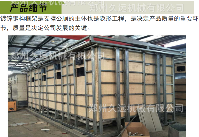 1、房體結構: 采用輕鋼龍骨結構,鋼材全部使用國家標準鍍鋅鋼材。根據房體的大小特選用國標方管(50-100)焊接而成。鍍鋅管厚度為2.8mm,方管經(jīng)過(guò)除銹后進(jìn)行鍍鋅、防腐處理。這樣就會(huì )延長(cháng)廁所使用壽命。