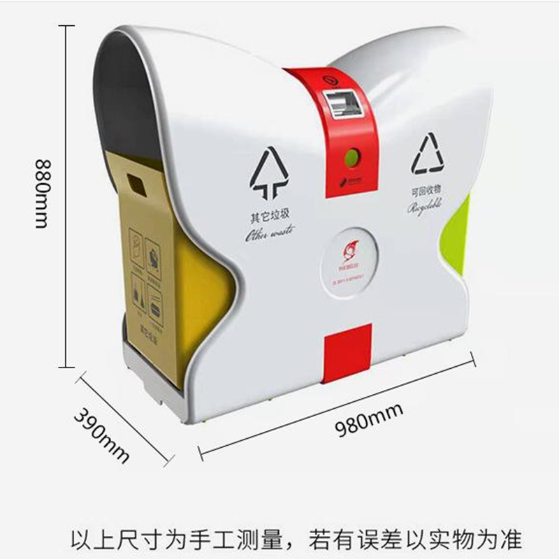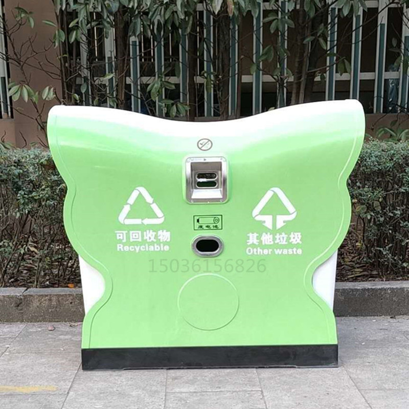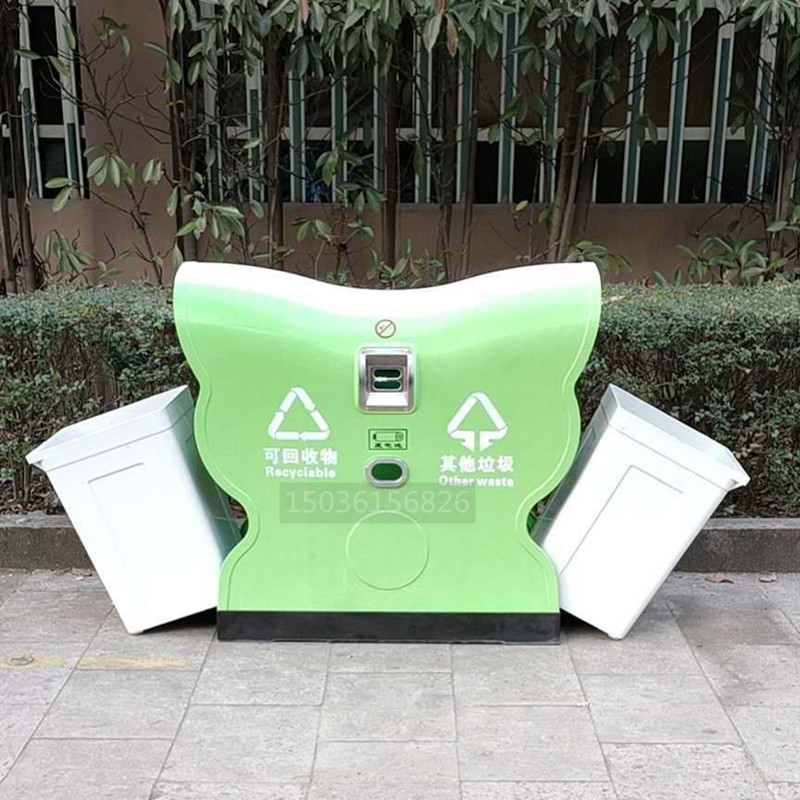 4.側板文字標識采用絲網(wǎng)印刷,印刷有“可回收物” “其他垃圾”,分類(lèi)標識參照《城市生活垃圾分類(lèi)標識》規定的名稱(chēng)、圖形、符號和顏色要求,LOGO可定制。