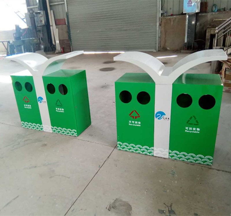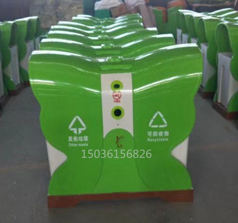 蝴蝶型分類(lèi)環(huán)保垃圾桶果皮箱采用SMC復合材料,3500噸壓機模壓成型,內外光潔度一致。